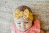 Each bow measures approximately 4.5" x 3” on a stretchy nylon band that fits newborn to toddler.