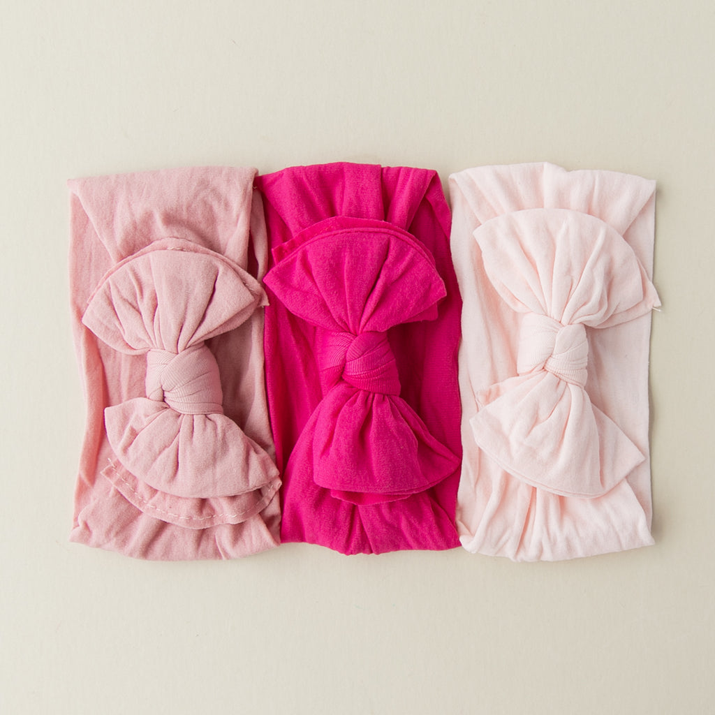 A set of our three pink baby bands: fuschia, rouge and barely pink.